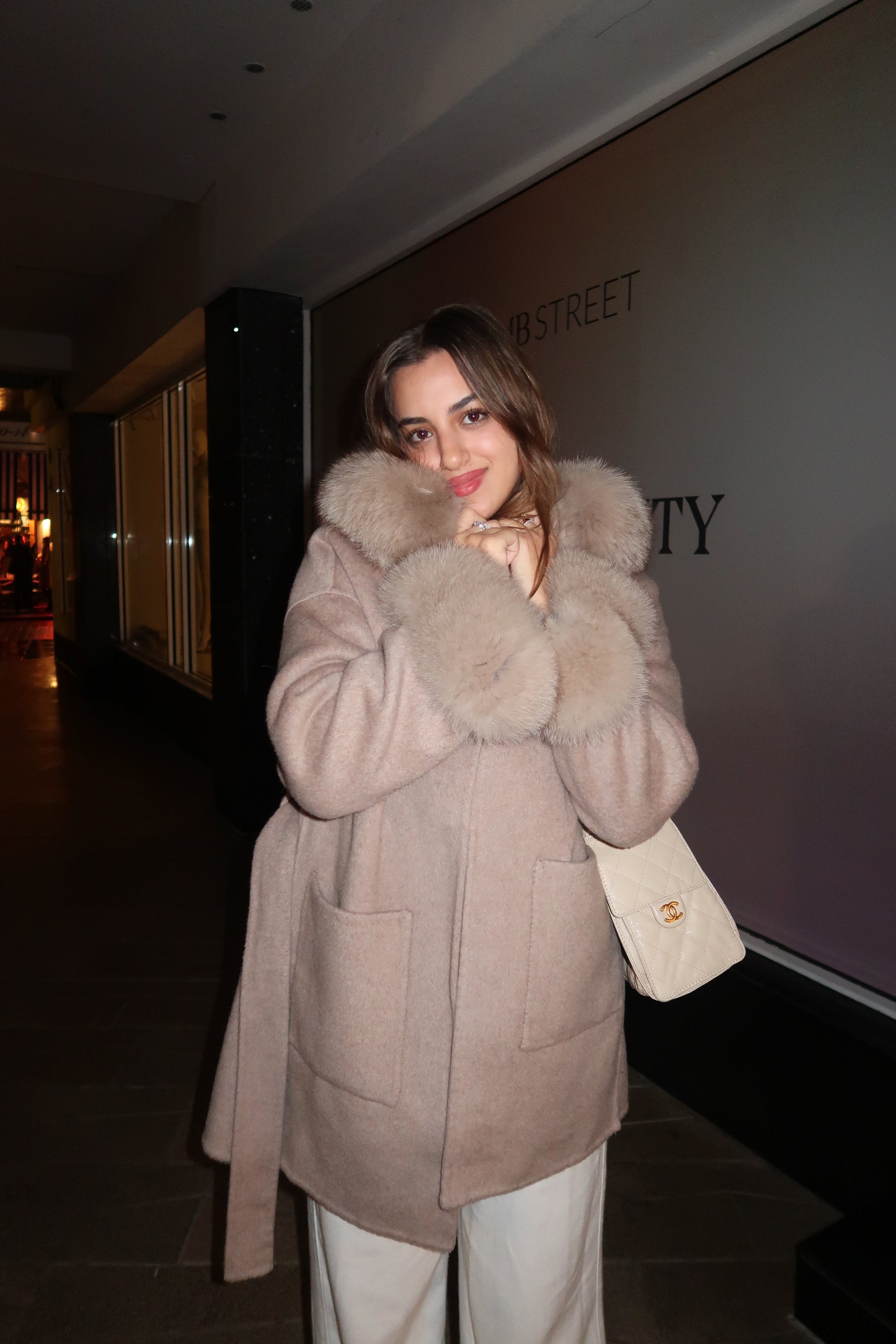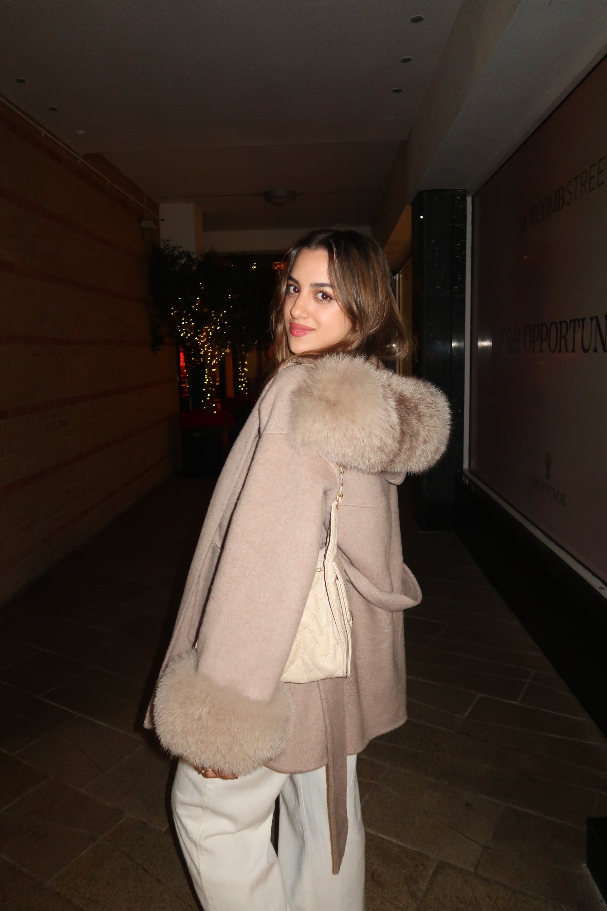 Meet The Latte, the short coat that effortlessly elevates every wardrobe. Cut from 100% Merino wool in a soft latte beige, it balances warmth, elegance and everyday versatility. To preserve craftsmanship and minimise overproduction, each piece is produced on a made-to-order basis in limited quantities. The plush fox fur cuffs add a refined touch, while the removable belt lets you choose between a relaxed silhouette or a cinched, tailored look. Designed for confident, understated styling, The Latte makes even simple outfits feel polished.